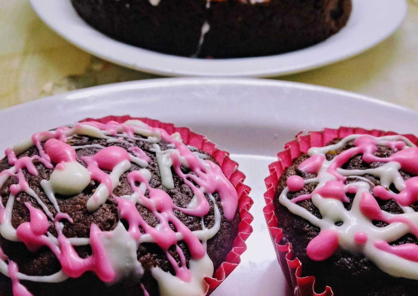 - Volcar la preparción en un molde forrado con papel manteca, enmantecado. Llevar a horno precalentado 160°/170° alrededor de una hora. Usé un molde de 20 cm de diámetro, e hice algunos individuales de 60 g de peso en pirotines para muffins. Dejar enfriar antes de desmoldar. Se puede espolvorear sólo con azúcar impalpable o lo tradicional con glasé, como tenía chocolate blanco y otros sabor frutilla, le puse derretido es opcional, a gusto.