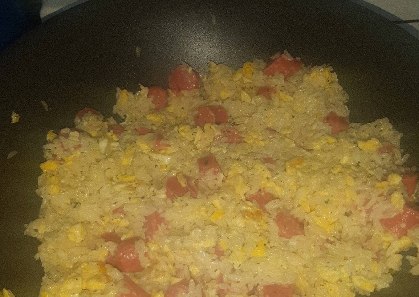 - Agregar el arroz cocido a la sartén con el revuelto de salchichas y dejar cocinar un rato mientras mezclamos para que todo se integre,