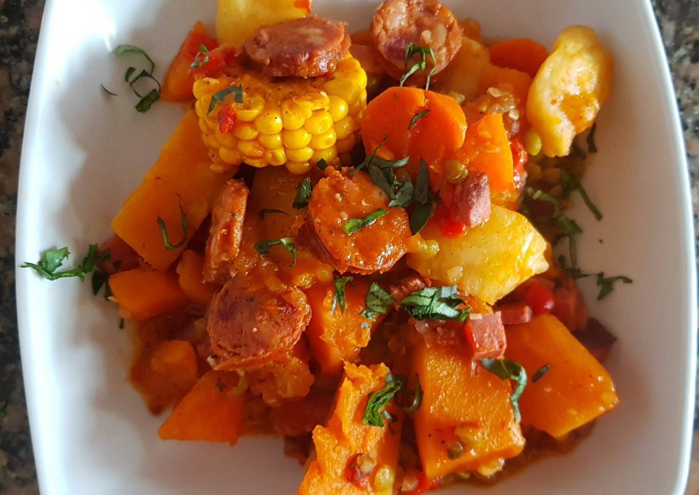 #delantaldorado _ Siempre trato de equilibrar los ingredientes para obtener una comida sabrosa y nutritiva, hoy pensamos un guisado que tuviera, proteínas, carbohidratos y fibra, esencial en toda alimentación. Pudimos lograr un guisado muy sabroso y que los alimentos ricos en carotenos se destacarán, la calabaza, la zanahoria, etc. Un plato rico y sencillo 👍👨🍳🙋♂️😊