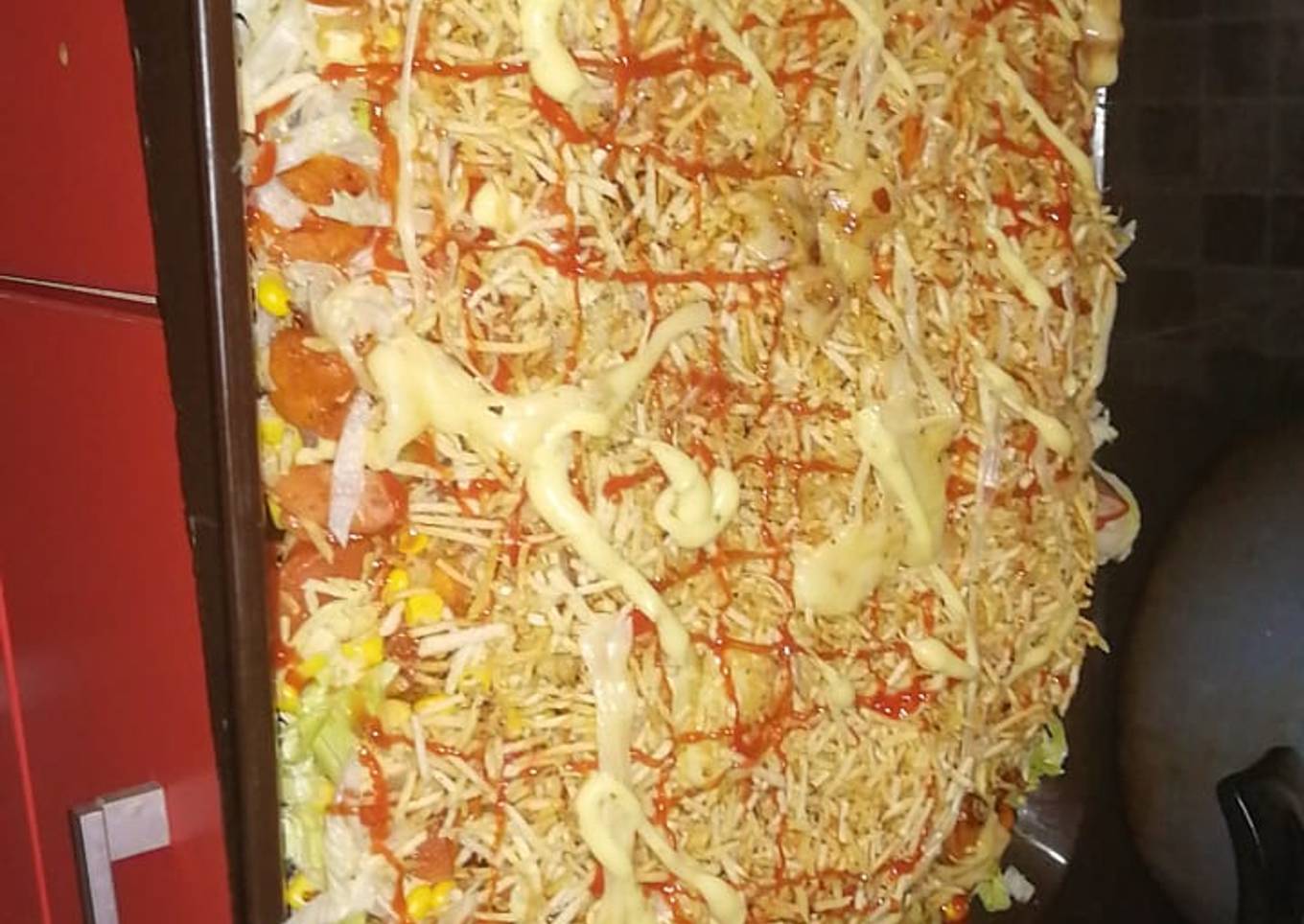 - Cocinar las papas. Partilas en cubo, asar las salchichas y el chorizo. Colocar las papas en un plato plano agregarle el queso rallado. Las papas fosforitos, las salchichas el chorizo. Y agregar las salsas encima. Las que quieran mayonesa salsa de tomate salsa rosada.